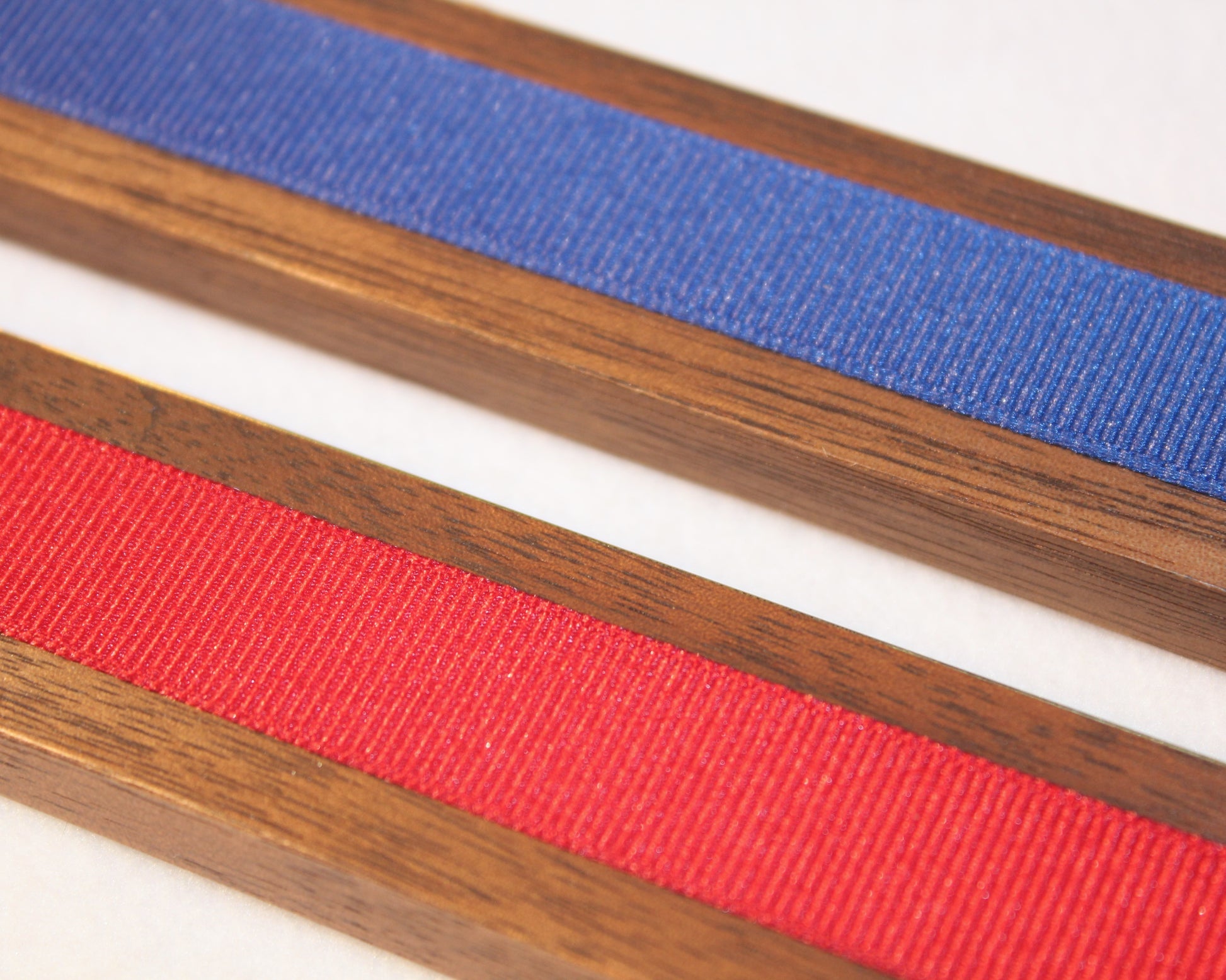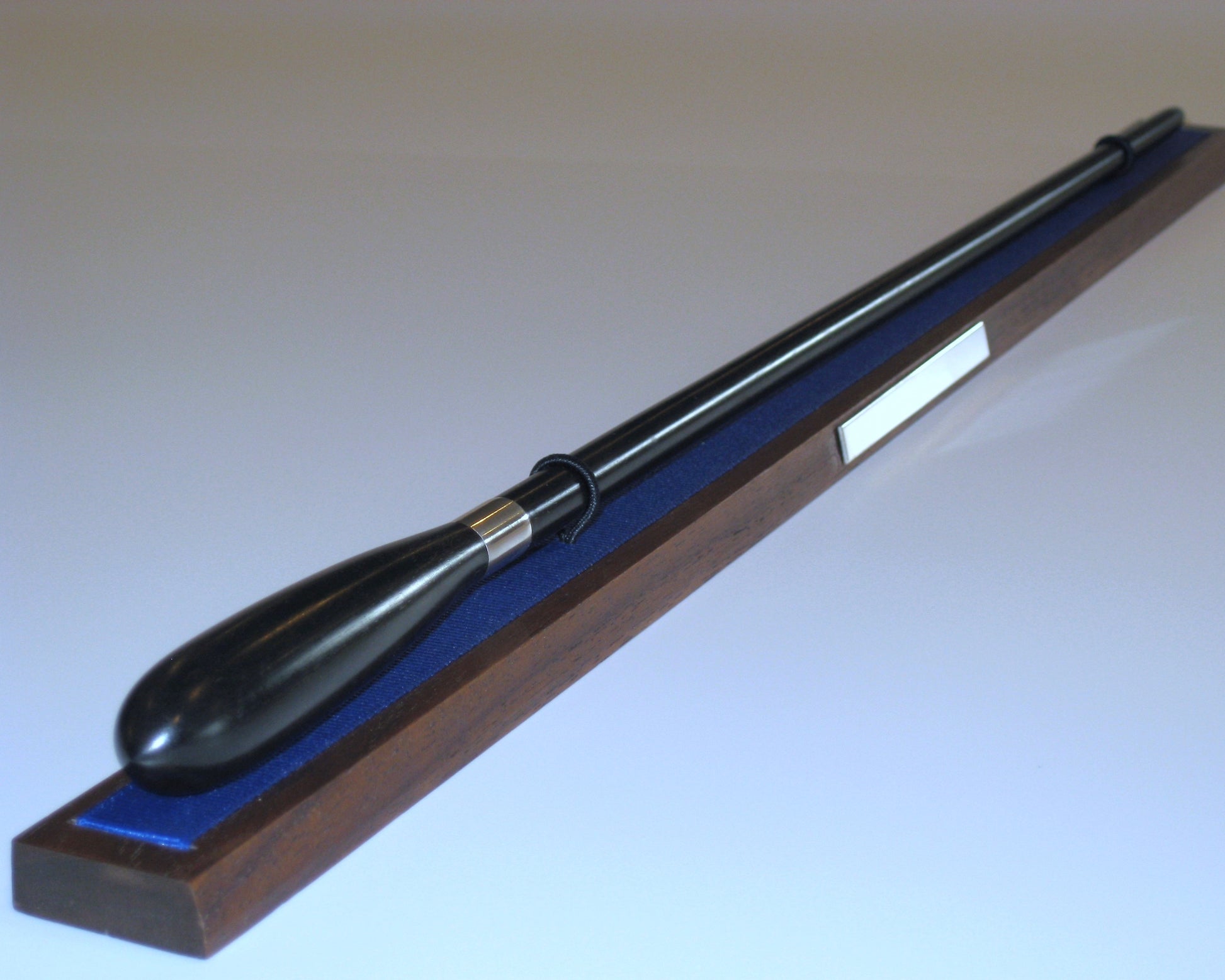 The baton rests on our Premium Black Walnut base with your choice of blue or red ribbon trim. There is a 6" long x 1/4" high Sterling Silver plate on the base for engraving your special message to the recipient**